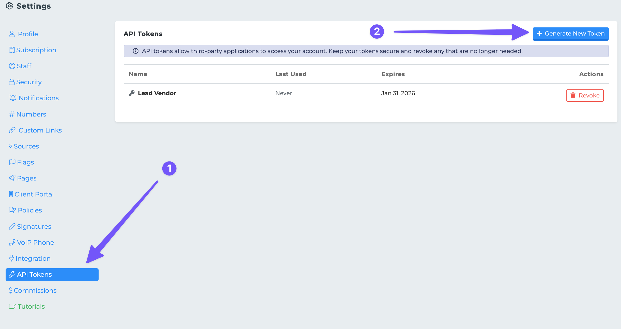 ⚠️ Revoking a token is immediate and permanent. Any integrations using that token will stop working.