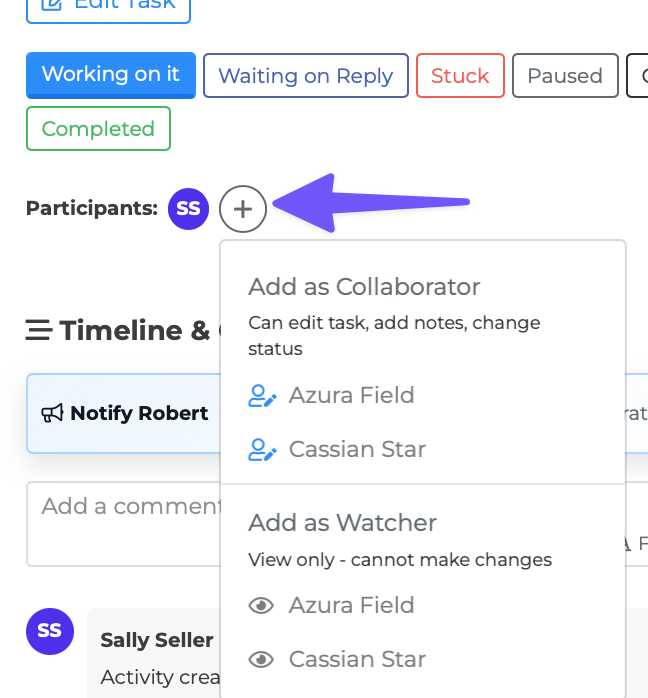 - Add as Collaborator — Lists available people. Adding someone here gives them full edit access. - Add as Watcher — Lists the same people. Adding someone here gives them view-only access.