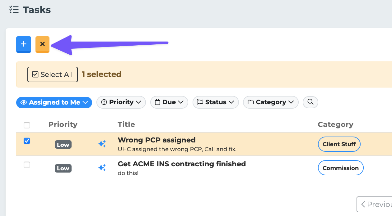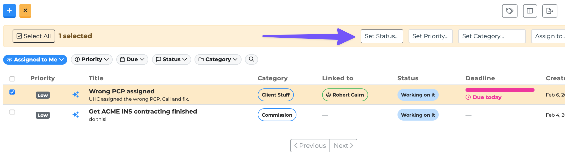 Use bulk actions after filtering your task list. For example, filter to a specific category, select all, then change the status to "Completed" to close out a batch of finished work.