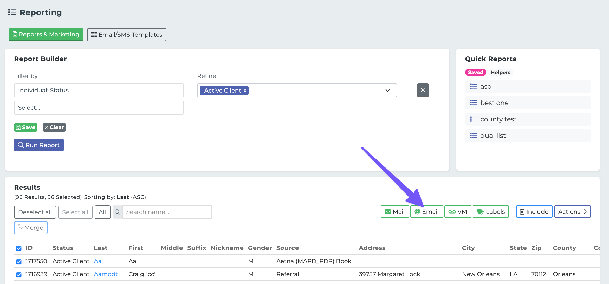 Next, navigate to the "Reports & Marketing" section of the Reporting page. Here, you can build a list of recipients using the filters available in the "Report Builder".