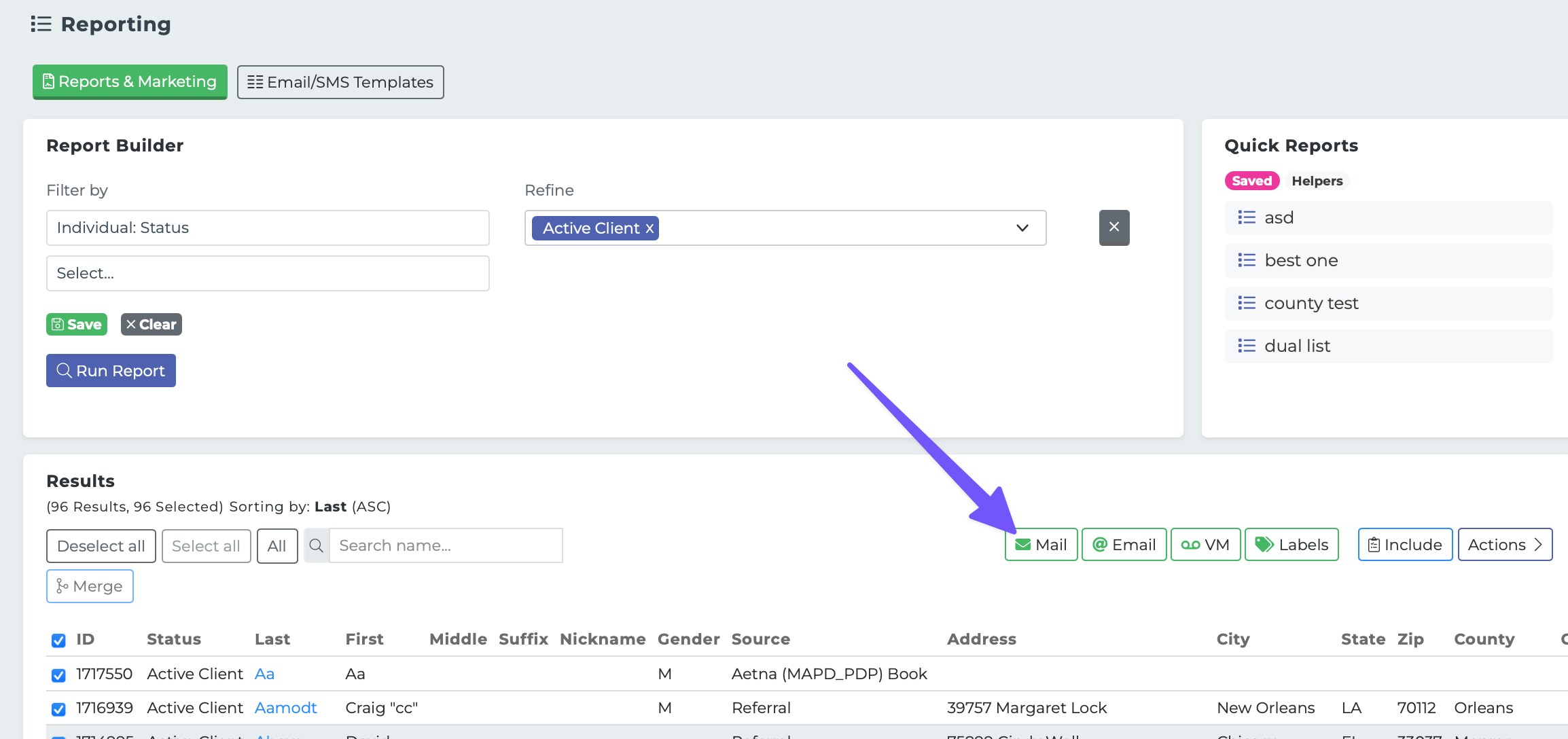 Navigate to the "Reports & Marketing" section of the Reporting page. Here, you can build a list of recipients using the filters available in the "Report Builder."