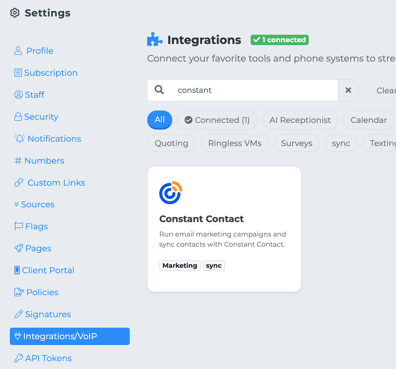 Once you confirm your credentials, you will be redirected back to the CRM. Your Constant Contact integration should now display as Connected.