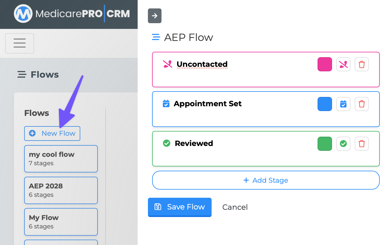Flows are comprised of various "Stages". Your Stages define the logical progression of a Flow.